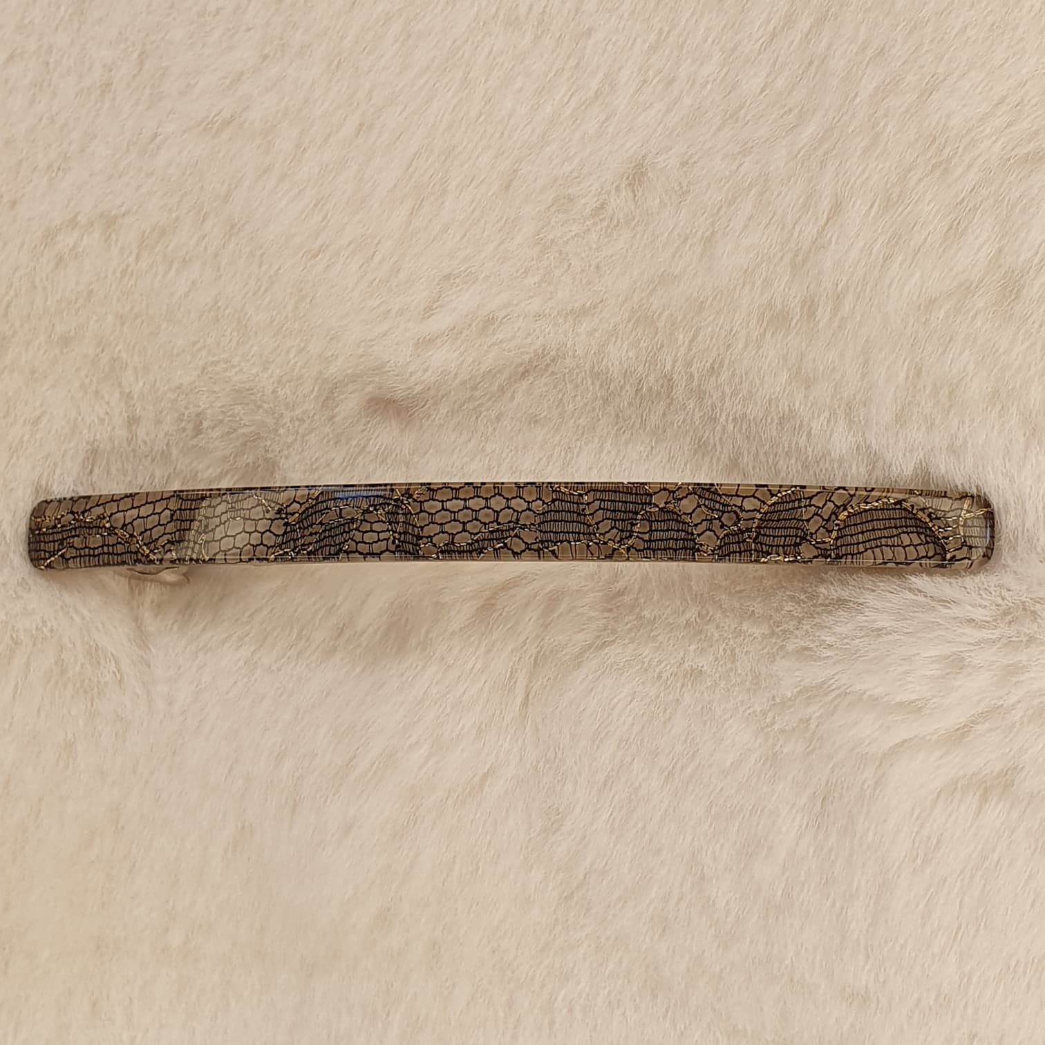 Tout le charme de cet accessoire réside dans son travail d’inclusion sous acétate, imitant à la perfection une dentelle noire de Calais rehaussée de délicats fils dorés. Ses dimensions de 11 cm de longueur et 1 cm de largeur en font un bijou de tête d’un grand raffinement.