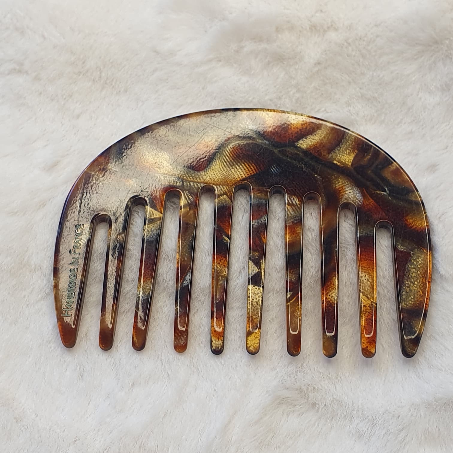 * Couleur : Le motif est un écaille de tortue riche dans des tons marron, ambre et noir, avec des reflets cuivrés. L’inscription « HANDMADE IN FRANCE » est visible sur le côté gauche.