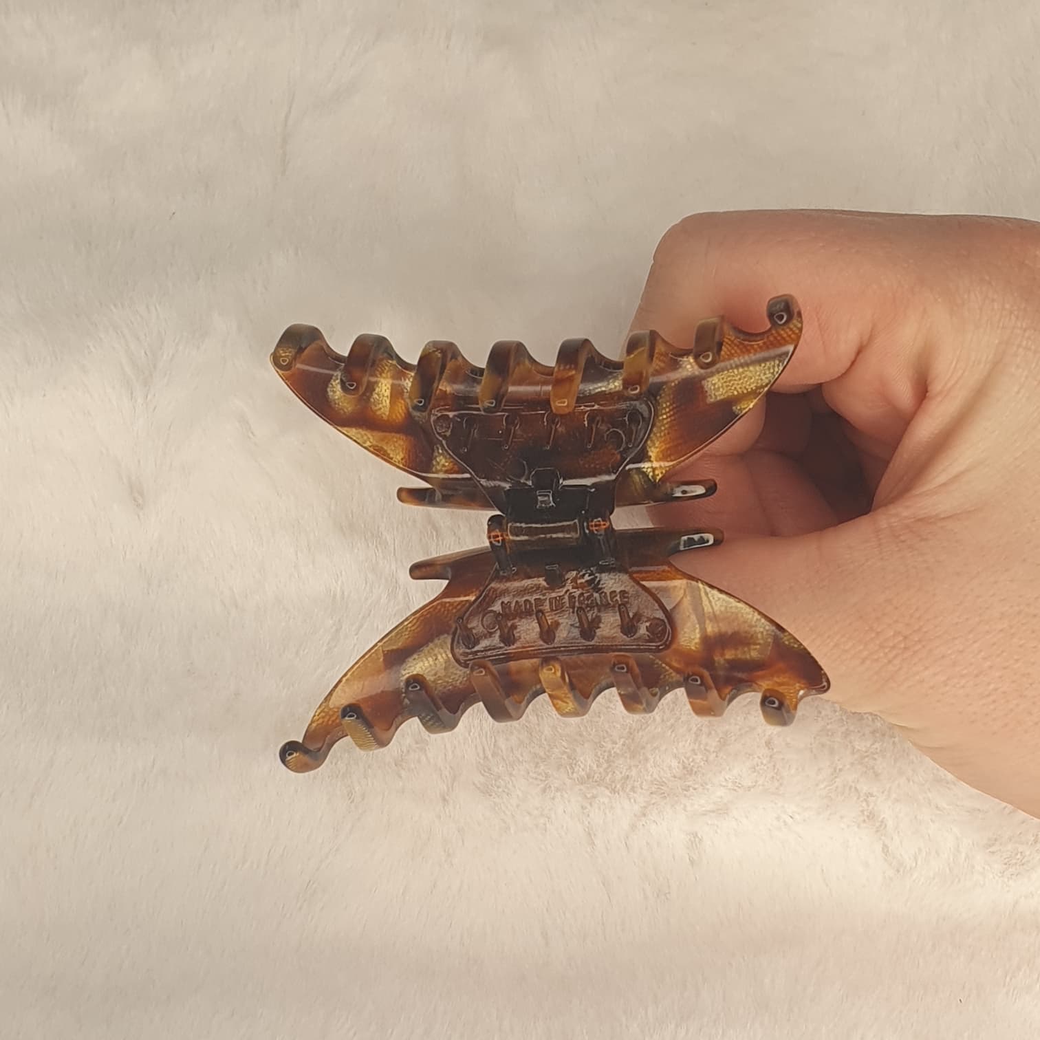 Design : La pince présente une forme élégante et ergonomique avec une courbure douce. Ses dents resserrées et son ressort robuste assurent une tenue parfaite, même sur les cheveux épais. La mention « Made in France » gravée à l’intérieur atteste de son origine et de sa qualité de fabrication.
