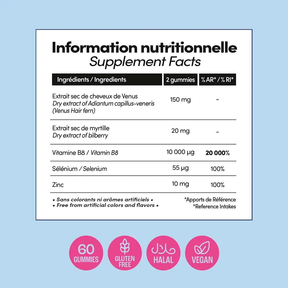 Sirop de glucose, sucre, extrait sec de partie aérienne de cheveux de venus (Adiantum capillus – Veneris L),arôme naturel,agent gélifiant : pectine,agent acidifiant : acide citrique,citrate de zinc, extrait sec de feuille de myrtille (Vaccinium Myrtillus L), concentré (carotte et cassis), sélénite de sodium,biotine (vitamine B8), acidifiant : citrate de sodium, agent d’enrobage : cire de carnauba.