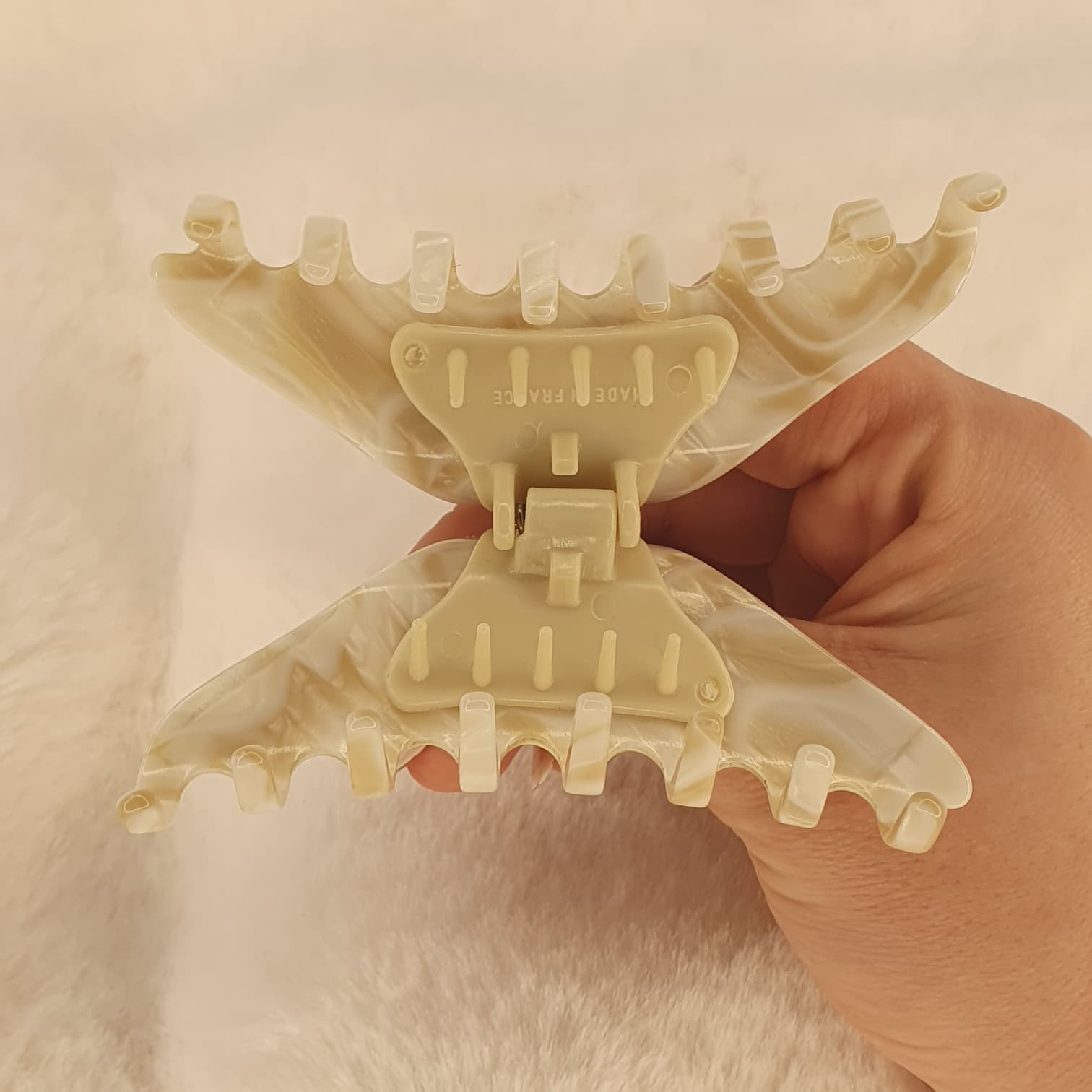 Design : La pince arbore une forme géométrique élégante, légèrement triangulaire. Ses dents robustes et son ressort de haute qualité, estampillé « Made in France », garantissent un maintien ferme et confortable, idéal pour relever l’ensemble de la chevelure avec style.
