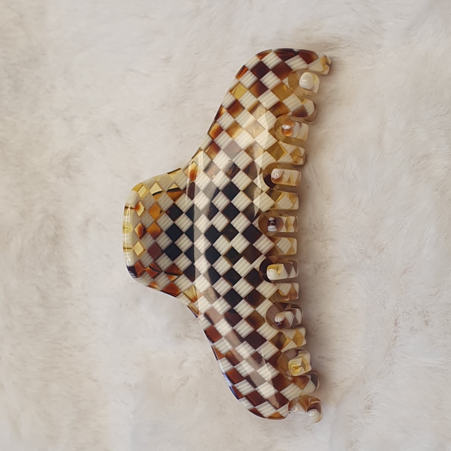 *Design et Motif : Le motif est un damier brun, ambre et crème qui confère un style très distinctif et moderne. Les larges ailes de la pince sont clairement visibles lorsqu’elle est ouverte.