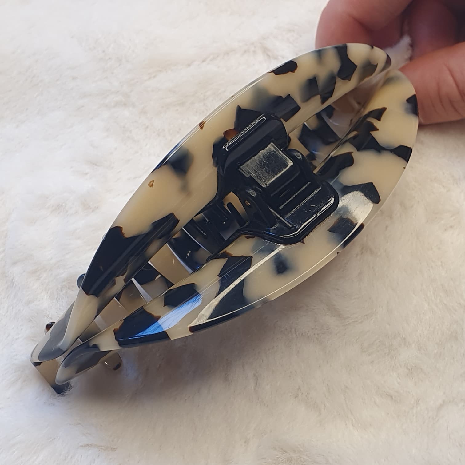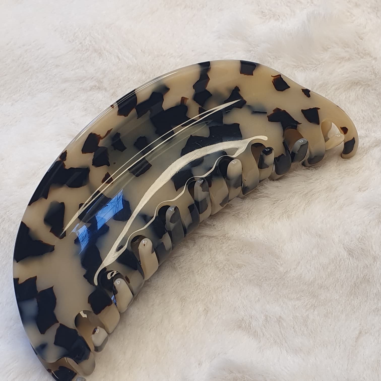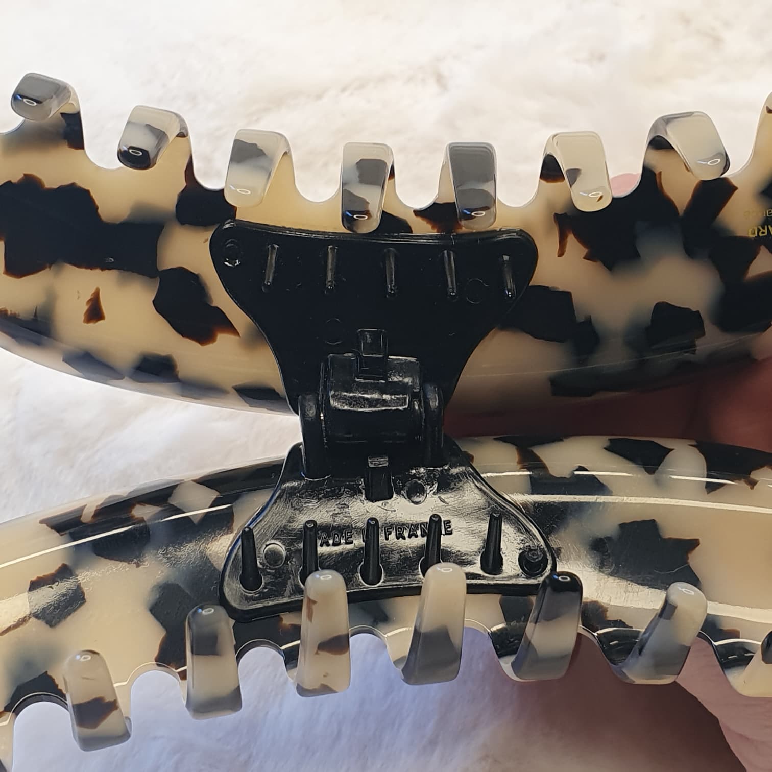 *Design et Motif : La pince arbore un motif écaille de tortue claire, souvent appelé léopard ou dalmatien, combinant de larges taches noires sur un fond blanc cassé/crème. Ce motif est très moderne et voyant.